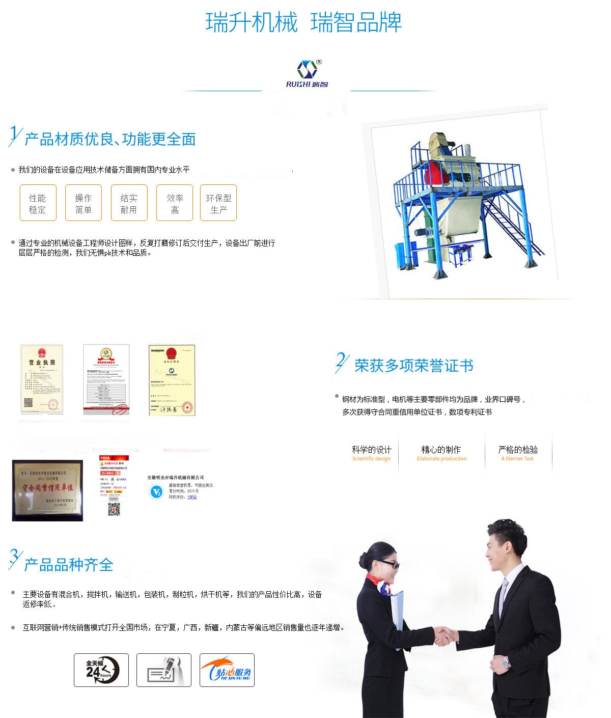 安徽瑞升機(jī)械制造有限公司坐落在明光市工業(yè)園區(qū),本公司產(chǎn)品主要用于粉料物質(zhì),顆粒物質(zhì)的混合、攪拌、輸送、包裝的自動(dòng)化生產(chǎn)設(shè)備。工廠占地面積為1萬(wàn)多平方現(xiàn)有6000平方米的生產(chǎn)車間和各類加工檢測(cè)設(shè)備,具備產(chǎn)品開(kāi)發(fā)、研制、設(shè)計(jì)、生產(chǎn)、試驗(yàn)、倉(cāng)儲(chǔ)運(yùn)輸?shù)饶芰Γ梢陨a(chǎn)多種規(guī)格、多種非標(biāo)定制的產(chǎn)品,并有多項(xiàng)技術(shù)獲得國(guó)家專利,擁有自主進(jìn)出口權(quán),公司憑借優(yōu)良的技術(shù)、先進(jìn)的工藝和科學(xué)的管理理念,所生產(chǎn)的產(chǎn)品已暢銷全國(guó)各地,部分產(chǎn)品已進(jìn)入馬耳他、印度尼西亞、韓國(guó)、羅馬尼亞、沙特阿拉伯、馬來(lái)西亞、印度、巴基斯坦、等國(guó)家和地區(qū),受到國(guó)內(nèi)外客戶的高度認(rèn)可和信賴。 本公司獲得守合同重信用單位證書(shū),對(duì)原材料的采購(gòu)極為細(xì)致,鋼材為標(biāo)準(zhǔn)型,電機(jī)等主要零部件均為品牌,數(shù)項(xiàng)專利證書(shū)。技術(shù)方面我司擁有一支國(guó)內(nèi)的技術(shù)和管理團(tuán)隊(duì),在機(jī)械設(shè)備應(yīng)用...公司資質(zhì)榮譽(yù)